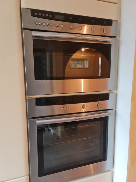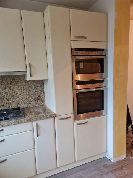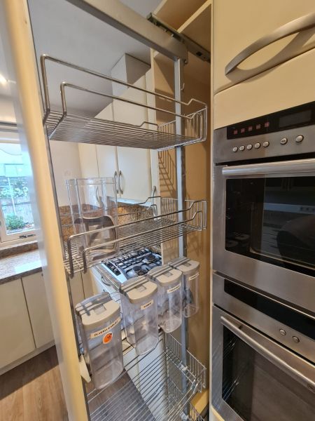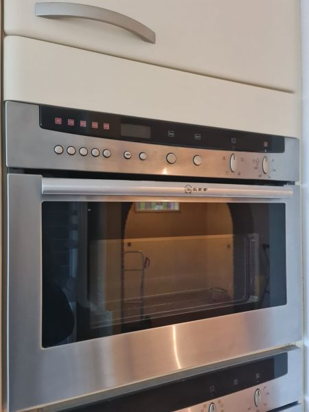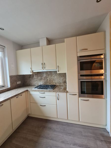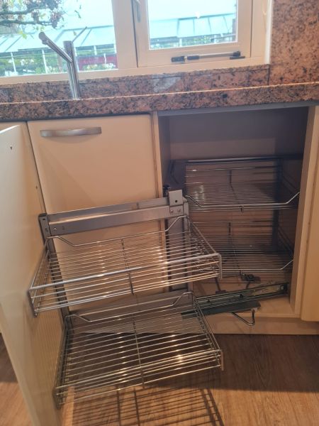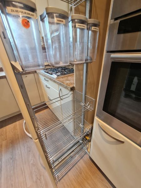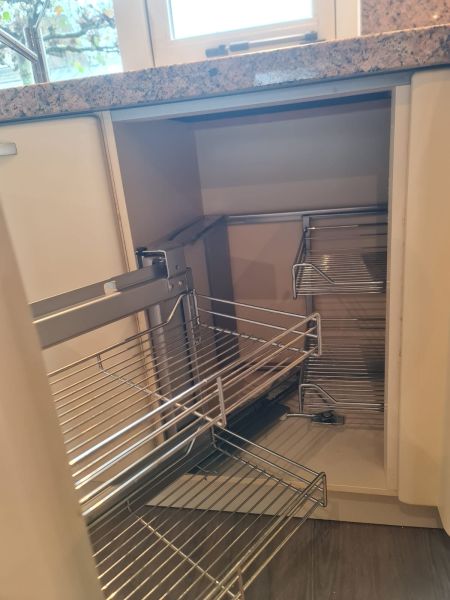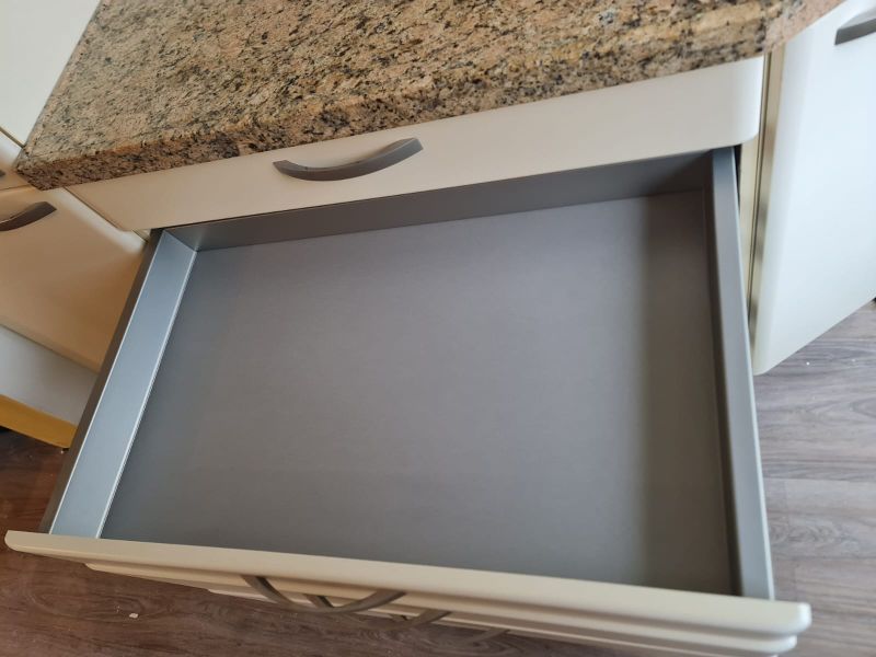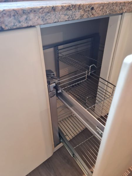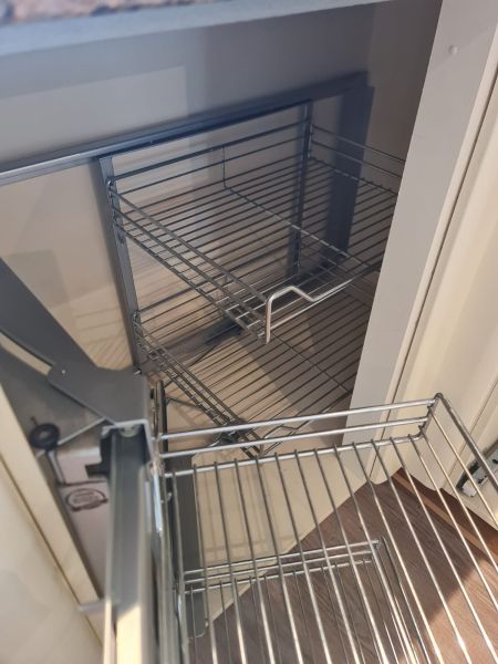 Bardzo ładna i po prostu fajna kuchnia z wieloma zaletami. Kuchnia jest dość duża bo ma aż 7m zabudowy. Jest wykonana bardzo solidnie, zaczynając od frontów z masywnej płyty MDF, przez okucia - wszystkie szafki otwierane jak i szuflady mają cichy dokym. Kuchnia jest bardzo funkcjonalna, ma dość miejsca roboczego na blacie oraz równie dużo miejsca do przechowywania. Zwracam uwagę na to jak duże, głębokie i pojemne szuflady tutaj mamy, dwie szafki całego i super szafkę narożną - tak zwana 'magic corner' czyli: magiczny narożnik. Szafka narożna ma 4 kosze, z mechanizmem wysuwania. Kuchnia ma aż 2 piekarniki. Na dole klasyczny piekarnik z termoobiegiem, a wyżej kombi piekarnik czyli piec z funkcją mikrofali 2w1. Kuchnia ma także w wyposażeniu bardzo ładną i dużą lodówke. Wysoka i pojemna lodówka z dużą zamrażarką z 3 szufladami. Obok zlewu jest zmywarka 45cm szeroka, na blacie płyta gazowa a w górnej szafce jest okap w zabudowie.