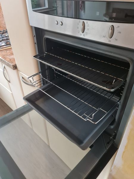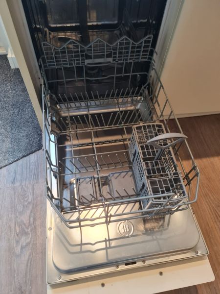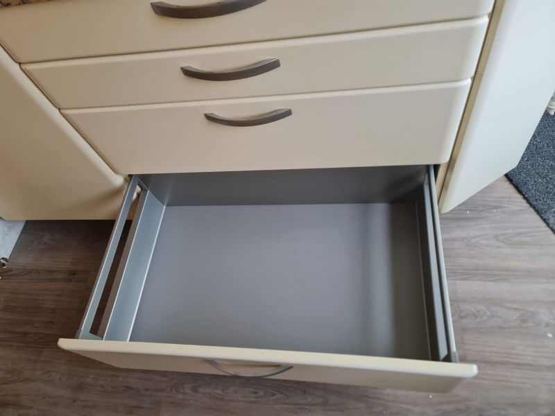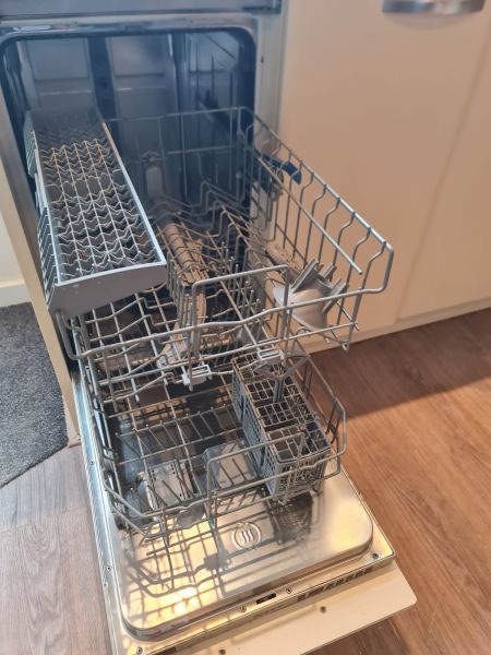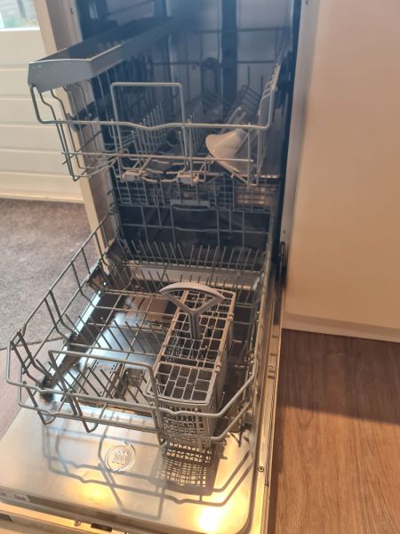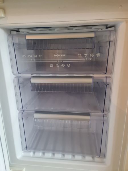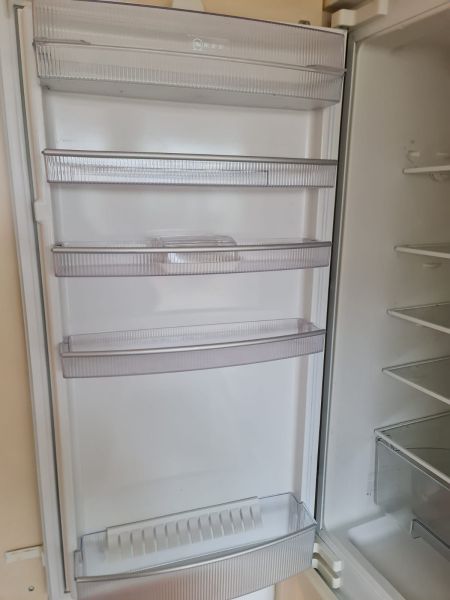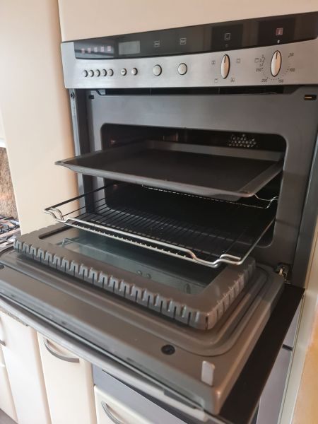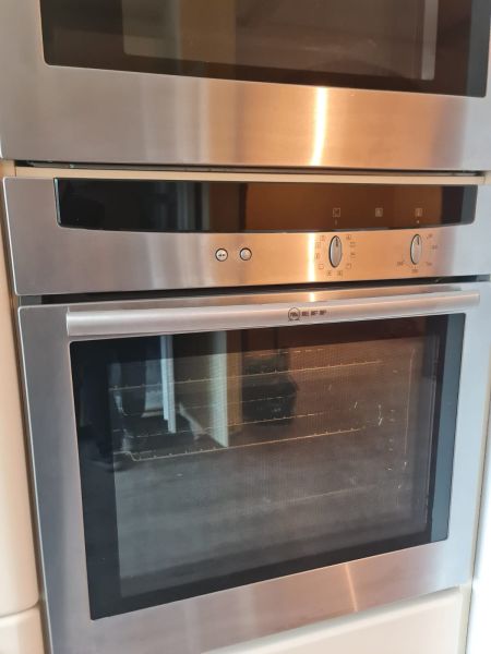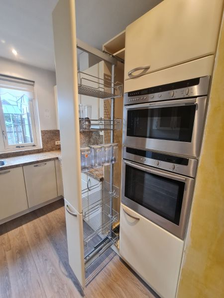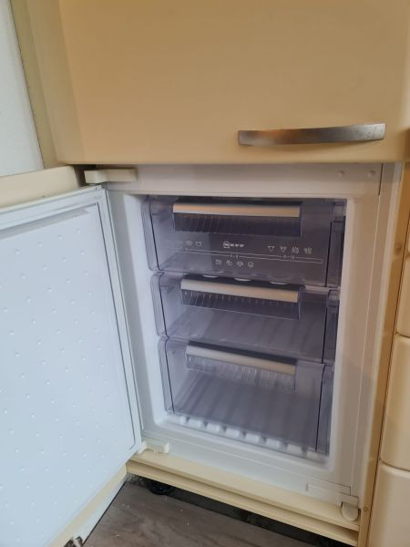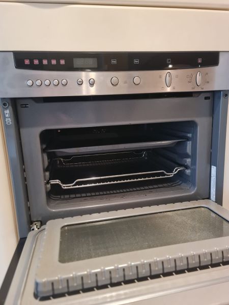 Bardzo ładna i po prostu fajna kuchnia z wieloma zaletami. Kuchnia jest dość duża bo ma aż 7m zabudowy. Jest wykonana bardzo solidnie, zaczynając od frontów z masywnej płyty MDF, przez okucia - wszystkie szafki otwierane jak i szuflady mają cichy dokym. Kuchnia jest bardzo funkcjonalna, ma dość miejsca roboczego na blacie oraz równie dużo miejsca do przechowywania. Zwracam uwagę na to jak duże, głębokie i pojemne szuflady tutaj mamy, dwie szafki całego i super szafkę narożną - tak zwana 'magic corner' czyli: magiczny narożnik. Szafka narożna ma 4 kosze, z mechanizmem wysuwania. Kuchnia ma aż 2 piekarniki. Na dole klasyczny piekarnik z termoobiegiem, a wyżej kombi piekarnik czyli piec z funkcją mikrofali 2w1. Kuchnia ma także w wyposażeniu bardzo ładną i dużą lodówke. Wysoka i pojemna lodówka z dużą zamrażarką z 3 szufladami. Obok zlewu jest zmywarka 45cm szeroka, na blacie płyta gazowa a w górnej szafce jest okap w zabudowie.