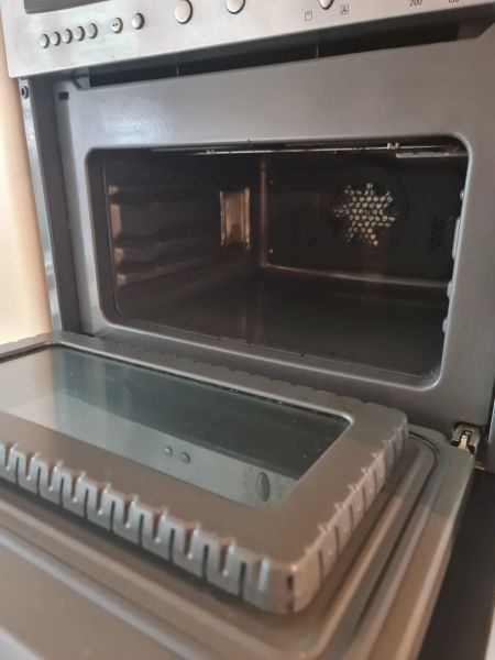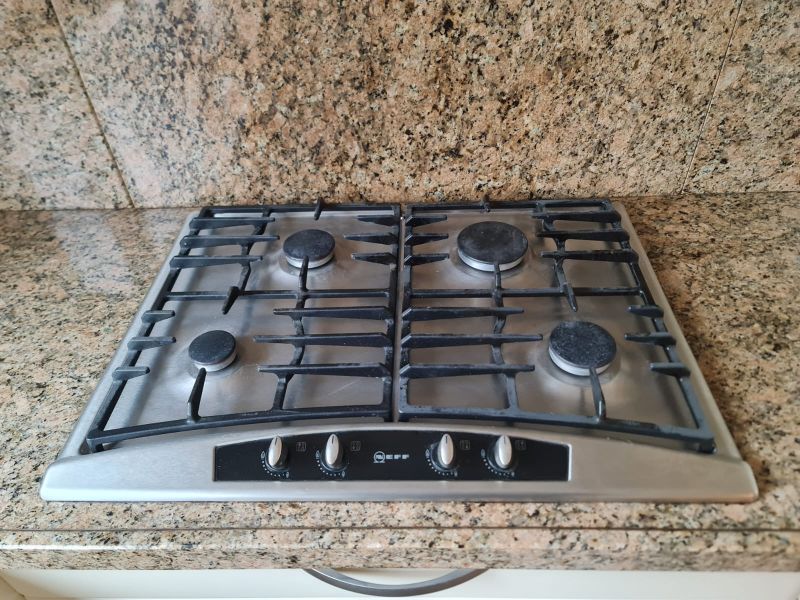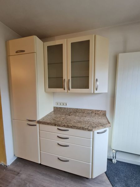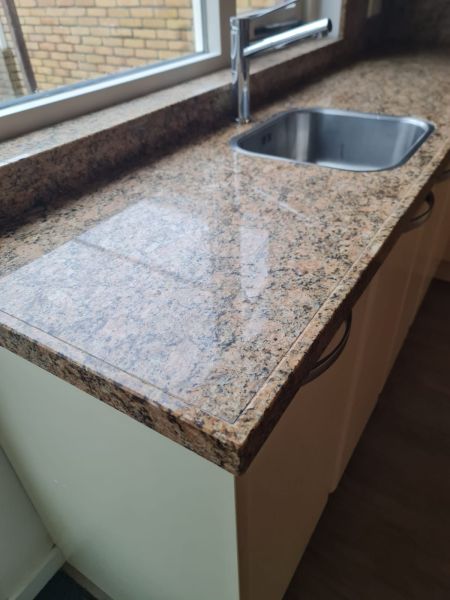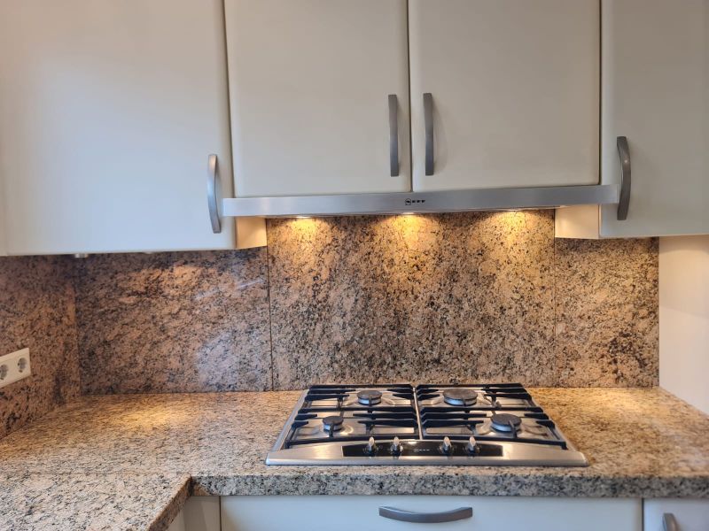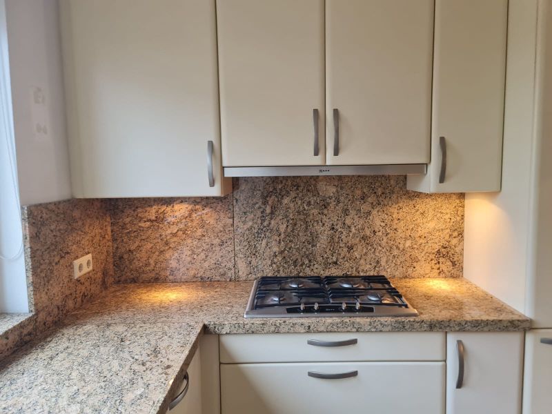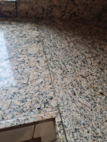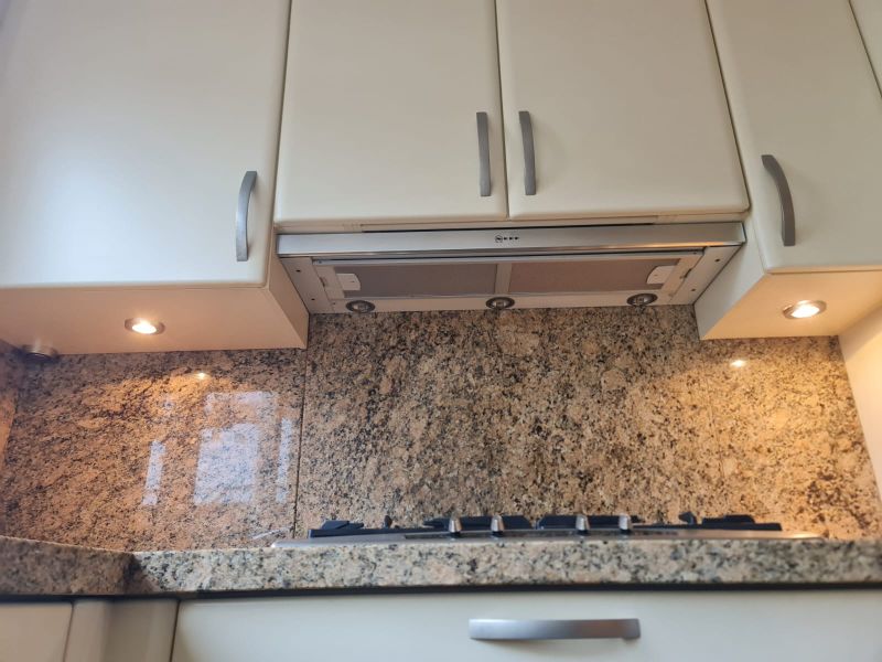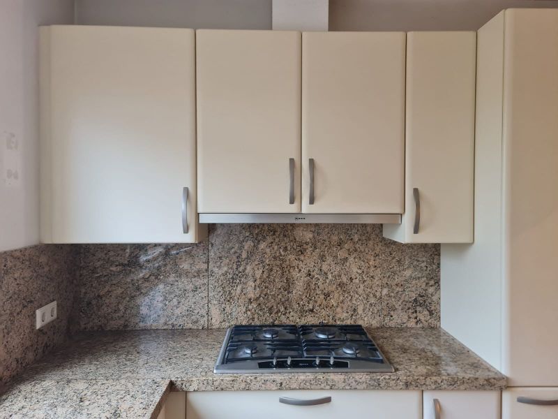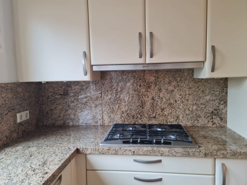 Cała kuchnia jak i sprzęty AGD są bardzo ładne, wszystko było czyściutkie, ładne - po prostu bardzo zadbane. Piękne blaty są z naturalnego kamienia, w kolorze brązowym, jak kawa z mlekiem. Pięknie pasuje do ciepłego i przytulnego koloru szafek i frontów. Wszystko razem wygląda spójnie. Nie odszukaliśmy się żadnych uszkodzeń, ani w szafkach w środku, ani na frontach. Malutkie uszkodzenie znalazłam na blacie - jest na zdjęciu w czerwonym kółku, uszkodzenie ma około 0,5cm i można je w łatwy sposób wypełnić masą do kamienia, żywicą lub innym wypełniaczem w zbliżonym kolorze lub przezroczystym.