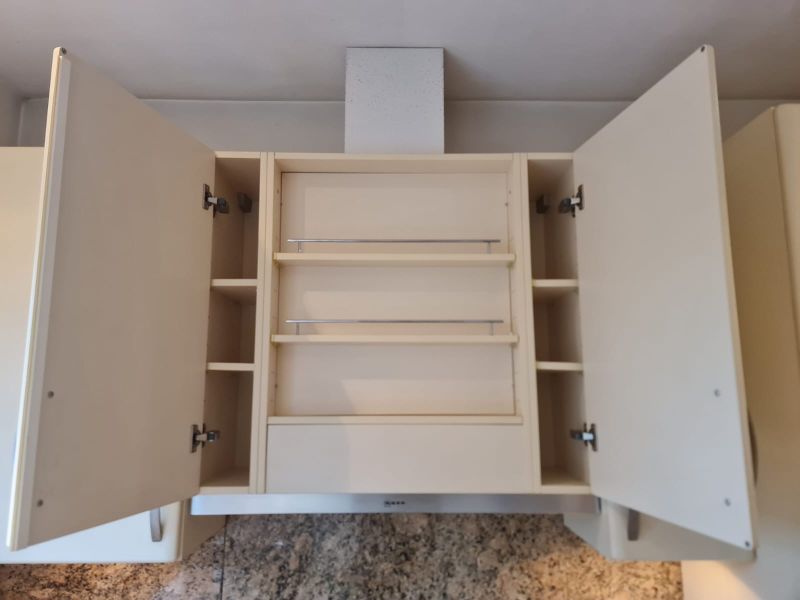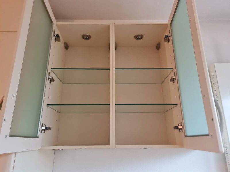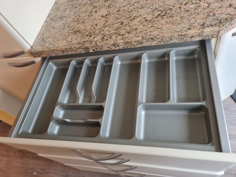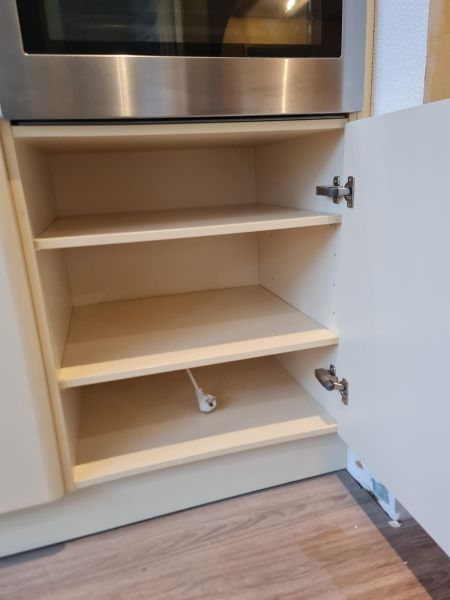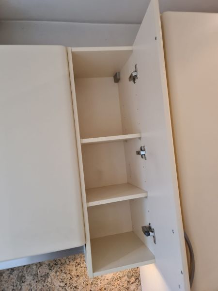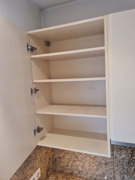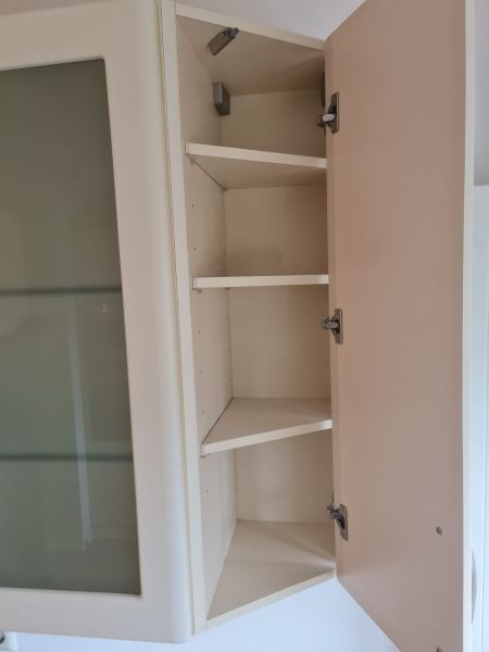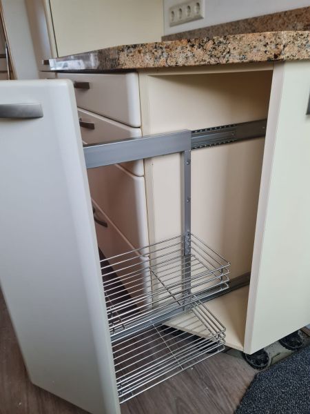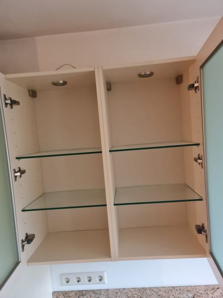 Listwy podszafkowe (kryjące nóżki szafek) nie są dostępne. Kuchnia ma oświetlenie w środku szafek - w witrynach i pod szafkami - jest dostępne razem ze wszystkimi kablami. Kamień ze ściany i cały kamień z parapetu - wszystko jest dostępne.