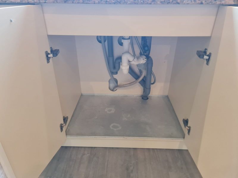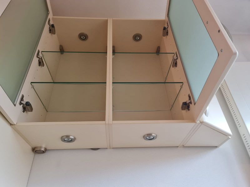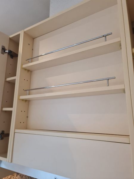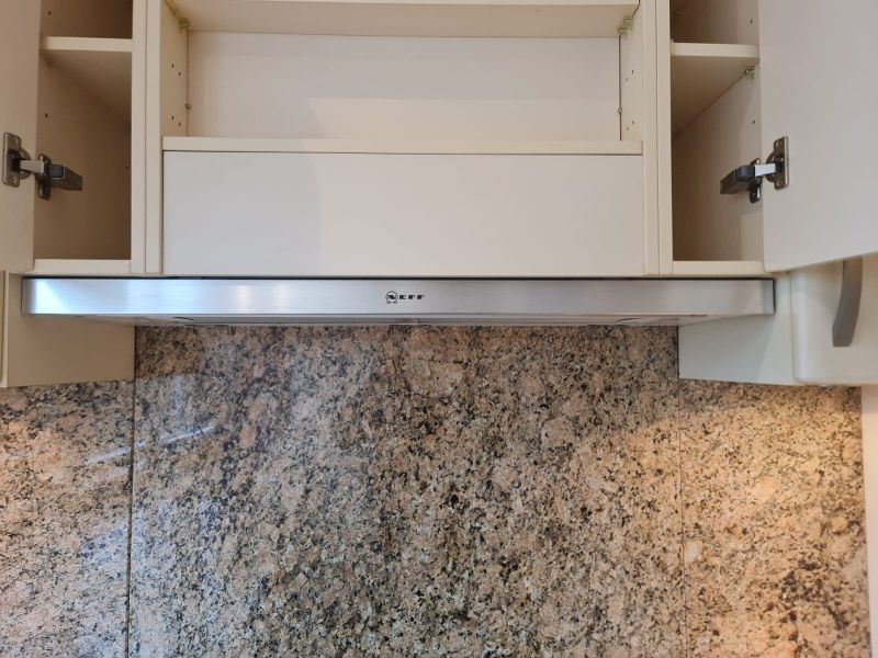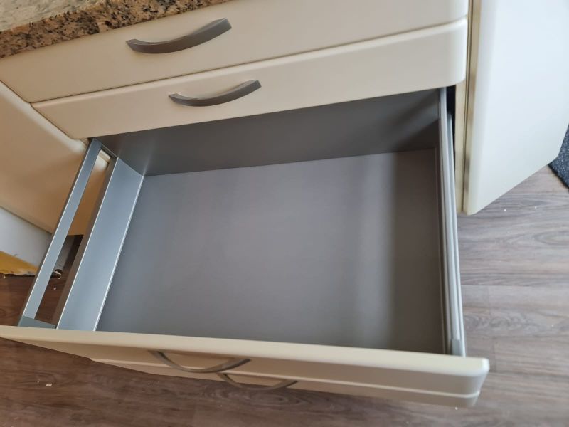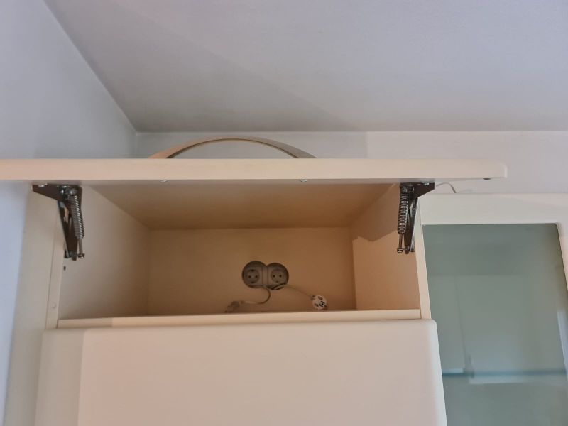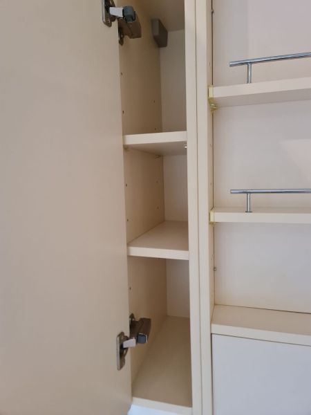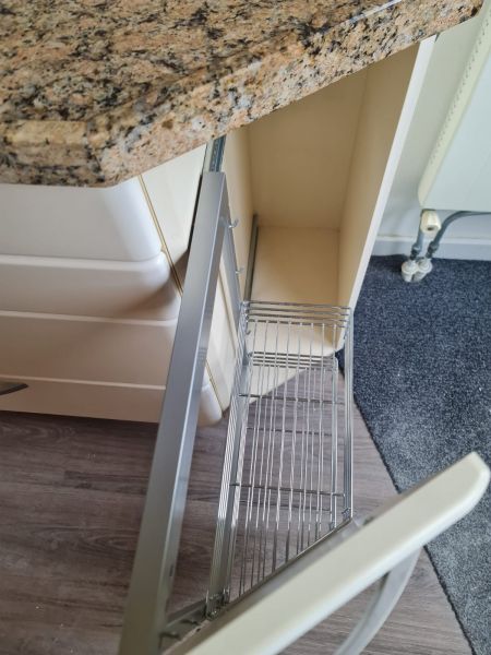 Listwy podszafkowe (kryjące nóżki szafek) nie są dostępne. Kuchnia ma oświetlenie w środku szafek - w witrynach i pod szafkami - jest dostępne razem ze wszystkimi kablami. Kamień ze ściany i cały kamień z parapetu - wszystko jest dostępne.