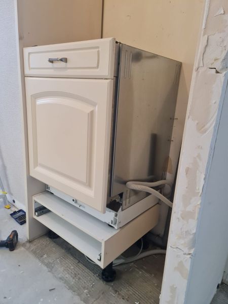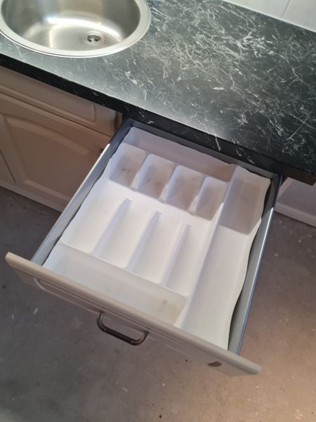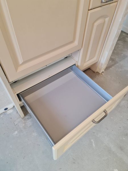 Zwracam uwagę na słupek obok szafki cargo. Na dole jest szuflada, nad nią zmywarka, a wyżej szafka z piecem w zabudowie. To są nietypowo, bo 3 osobne szafki, które postawiono jedna na drugiej, a nie jedna duża szafa. Dlatego mogą zostać w prosty sposób rozdzielone, zmywarka może stać na podłodze, a piekarnik zamontowany z szafce 60cm i także stać w zabudowie pod blatem jako dodatkowa szafka. W taki sposób do metrażu kuchni należy doliczyć dodatkowe 60cm zabudowy