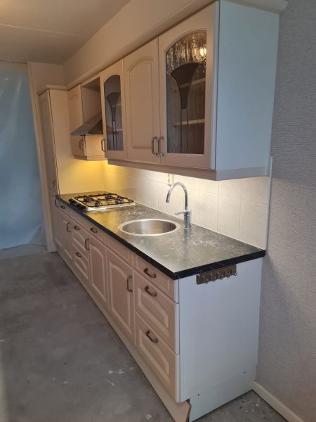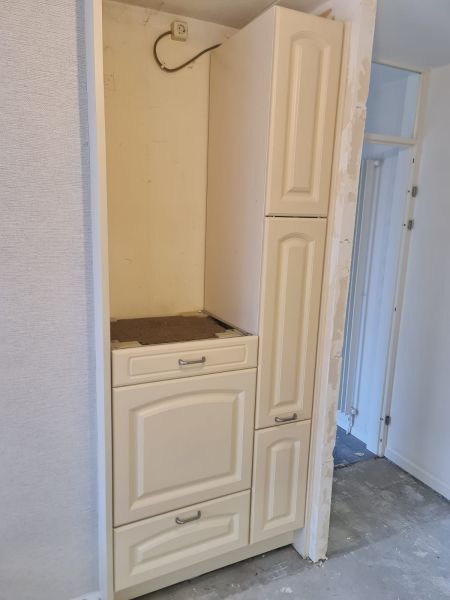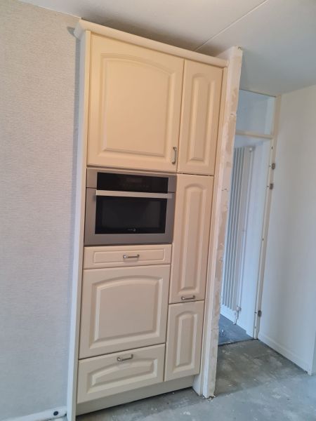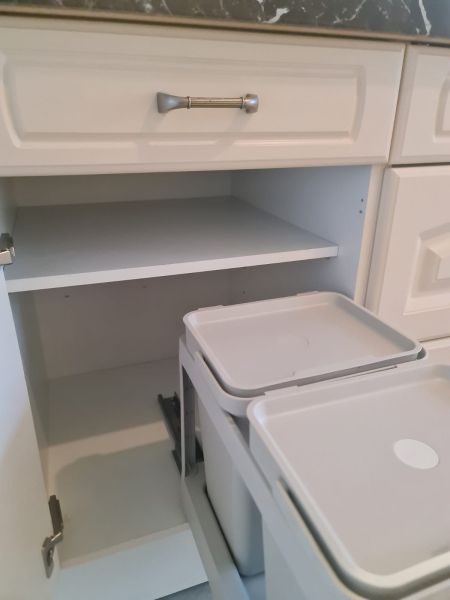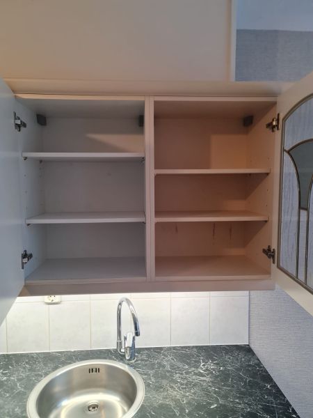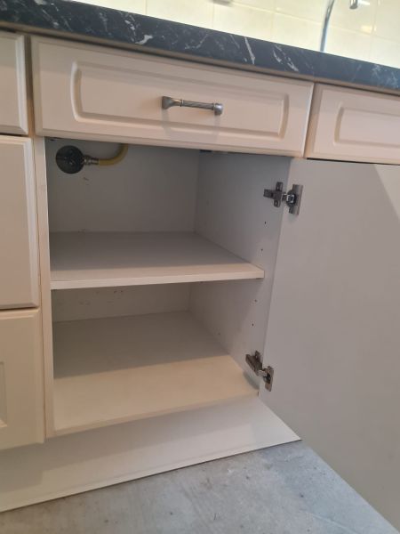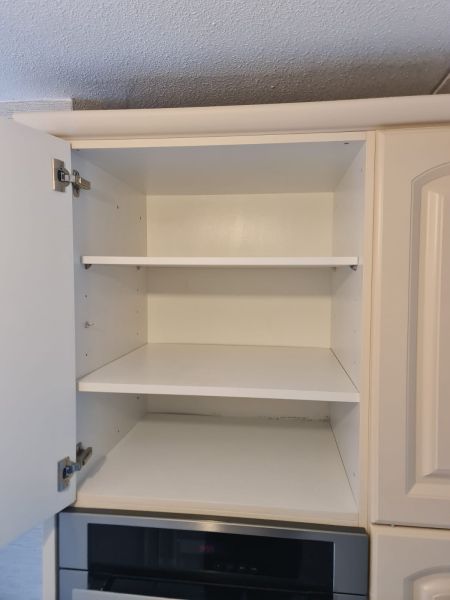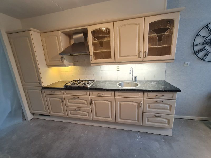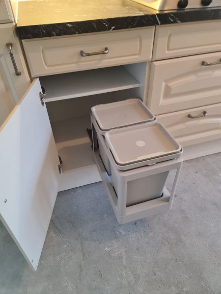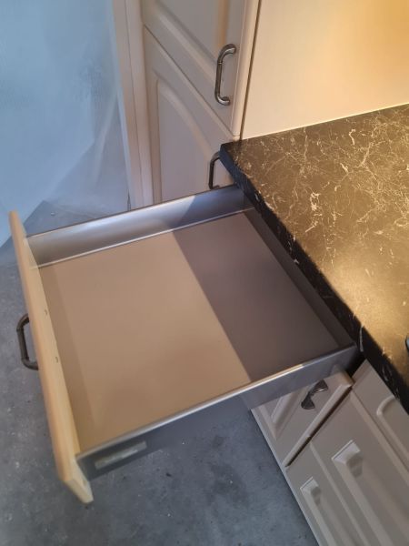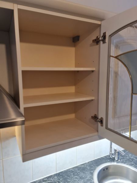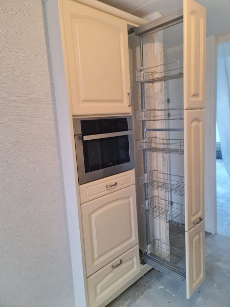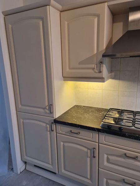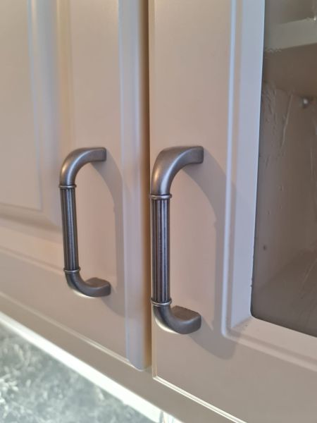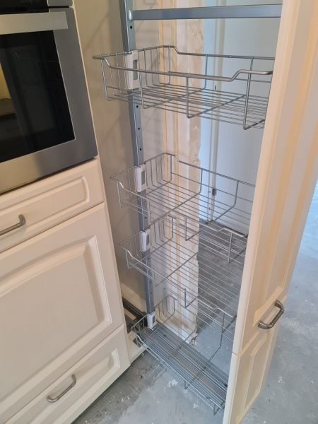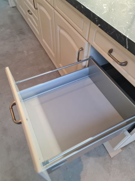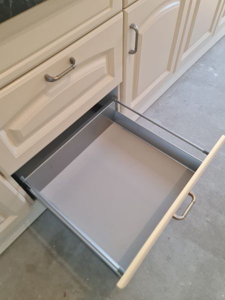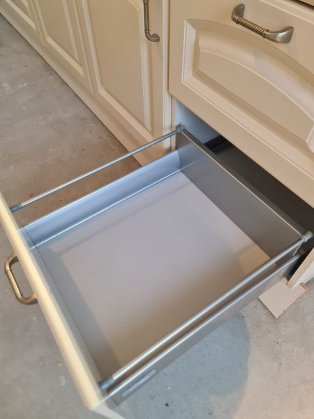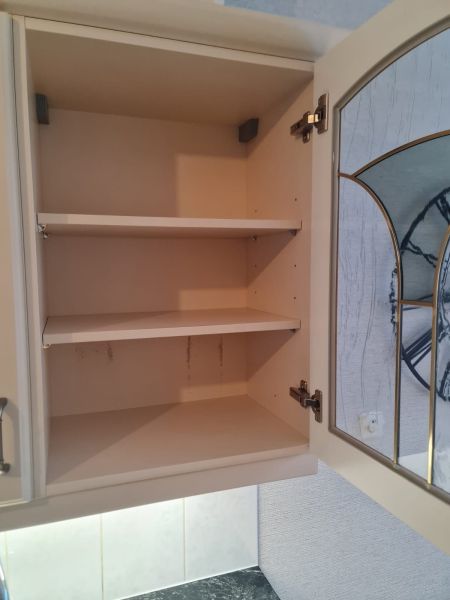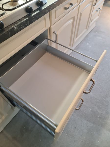 Bardzo ładna kuchnia w klasycznym stylu. Fronty z ramką z frezem. Fronty wykonane z płyty MDF. Korpusy szafek z dobrej jakości płyty meblowej. Oryginalnie na frontach okleina meblowa, ale kuchnie kupiliśmy z zamiarem lakierowania frontów. Planowana renowacja, okleina zostanie ściągnięta i lakierowanie natryskowe na kolor kaszmirowy. Po wykonaniu renowacji dodamy zdjęcia po lakierowaniu.