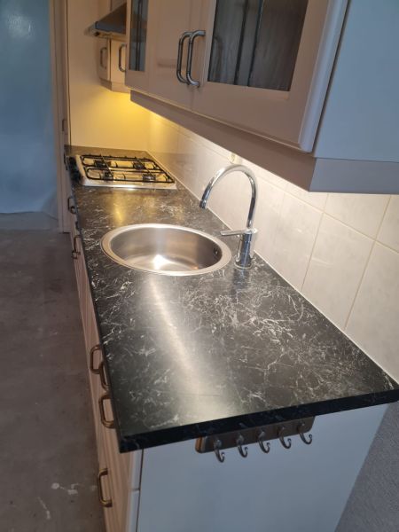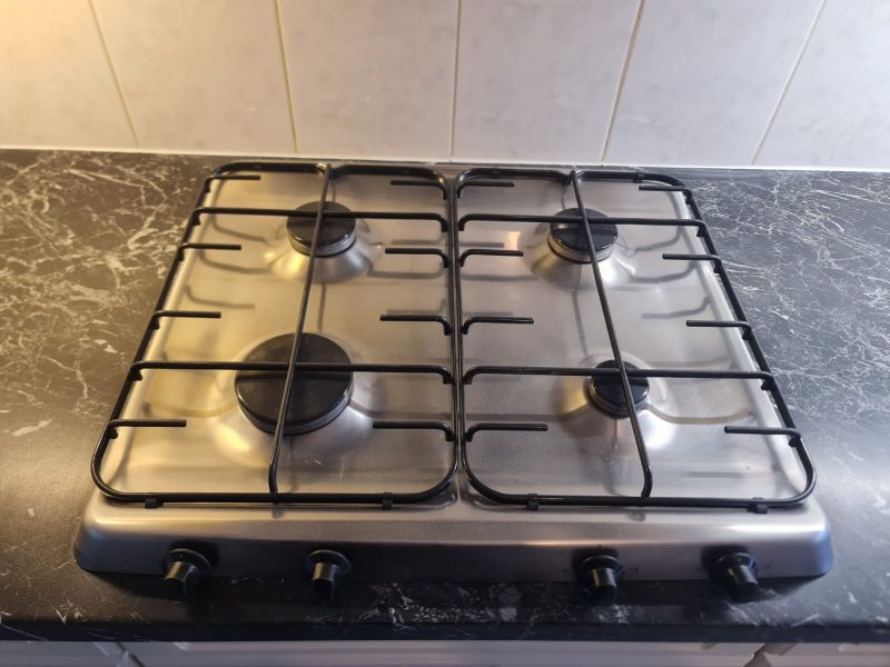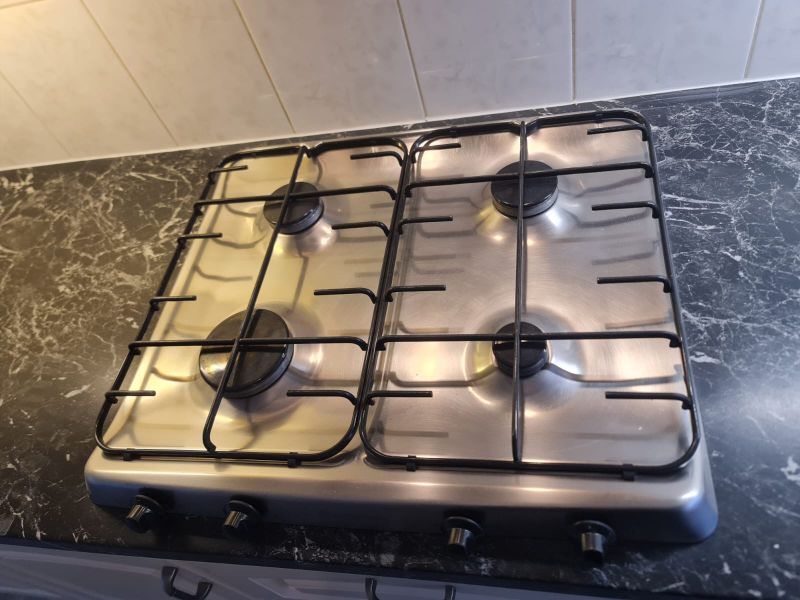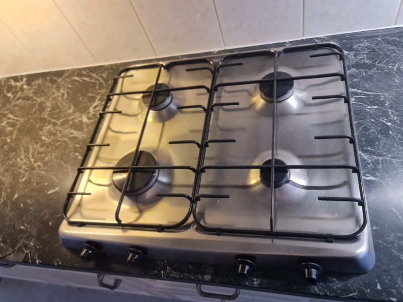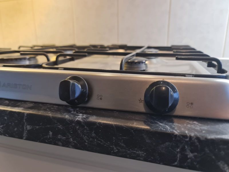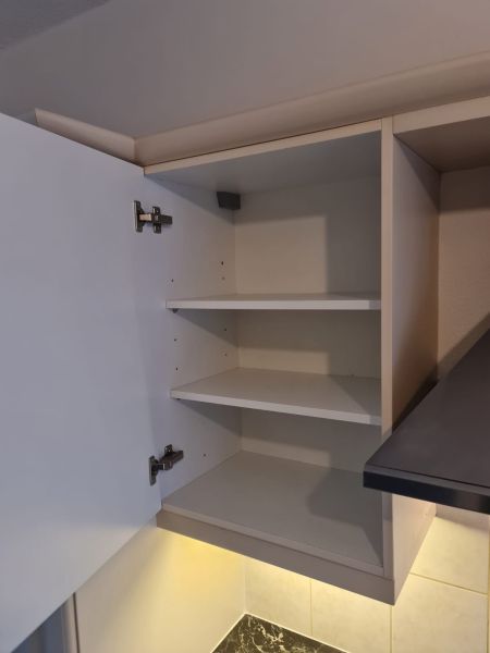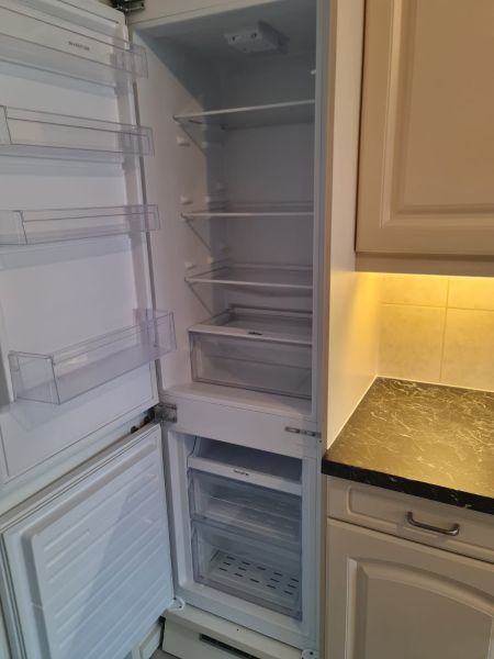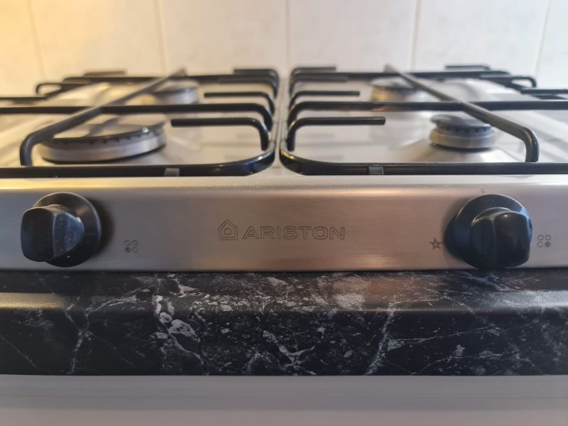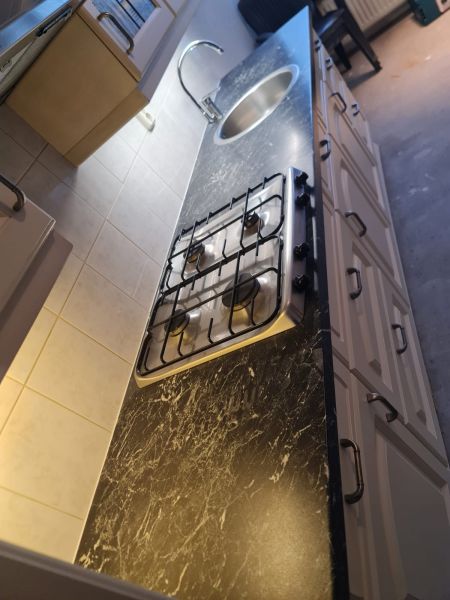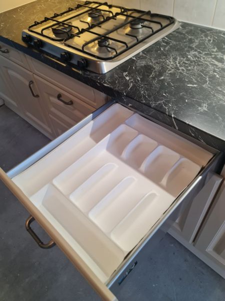 Kuchnia jest bardzo ładna, zadbana, ma dużo miejsca do przechowywania, dużo szuflad (wszystkie z cichym domykiem) i pojemne cargo. Kuchnia ma w wyposażeniu bardzo ładną i dużą lodówke z zamrażarką, piekarnik, zmywarkę, płytę gazową 4 palnikową i okap. Wszystkie sprzęty są bardzo ładne i zadbane.