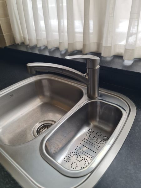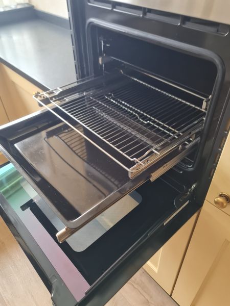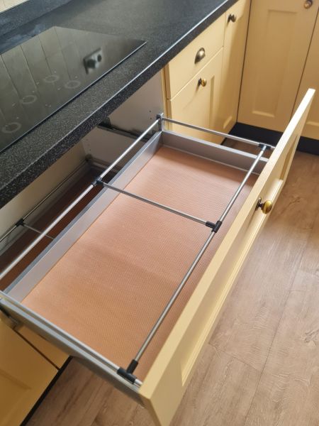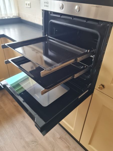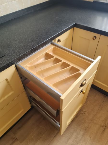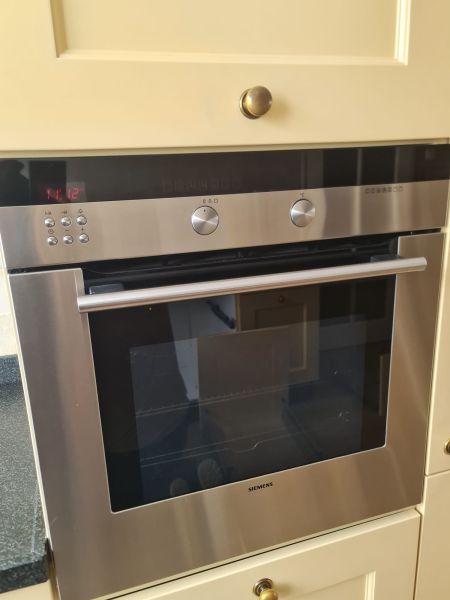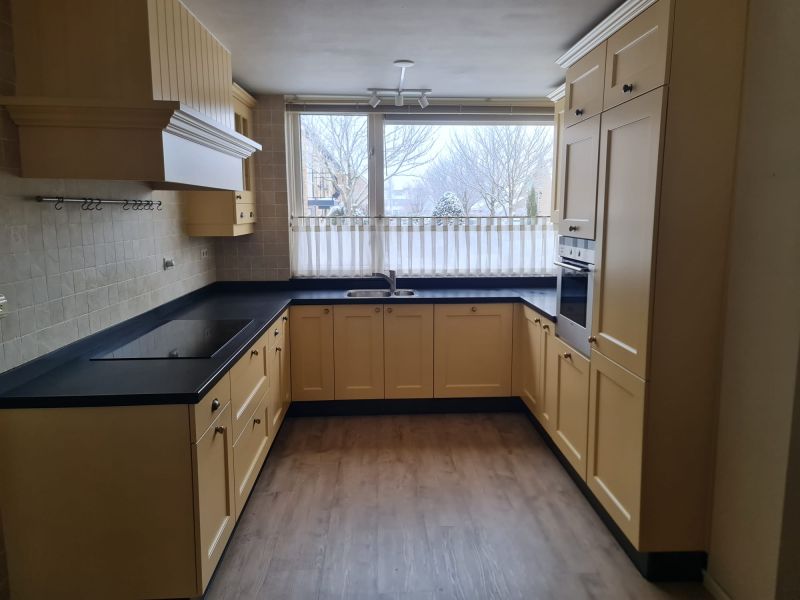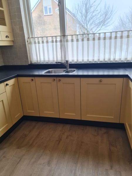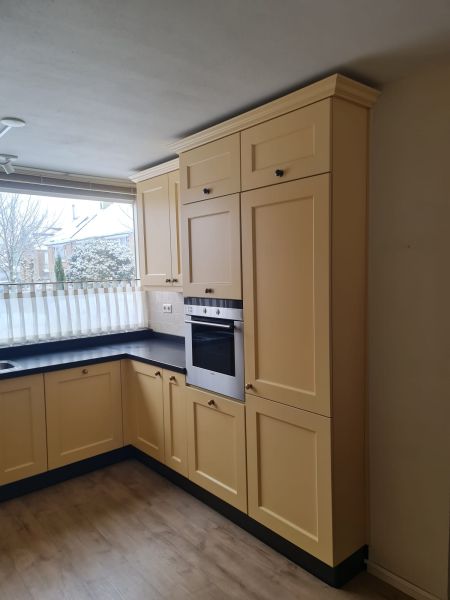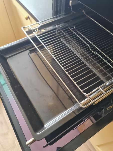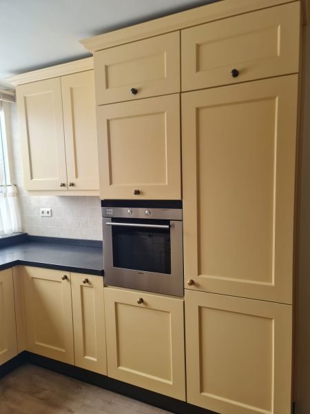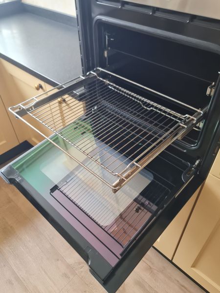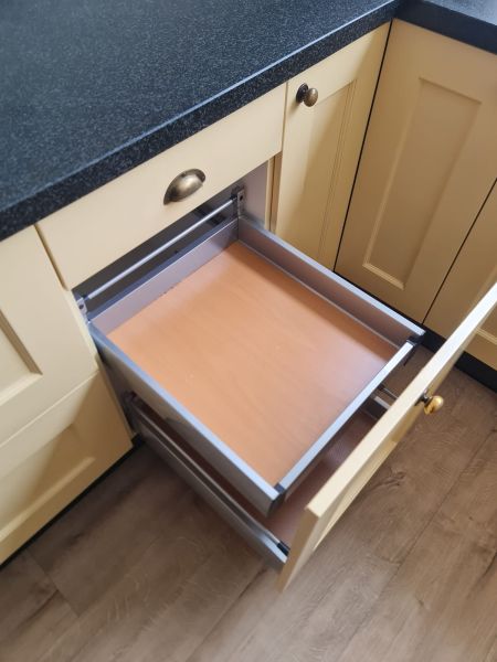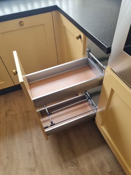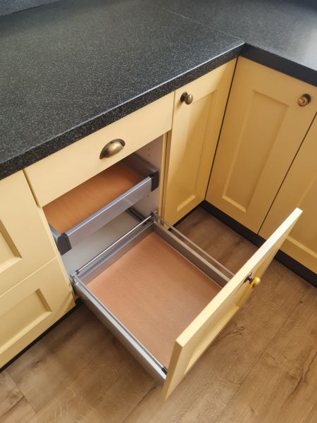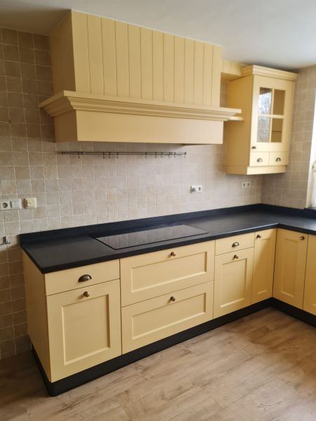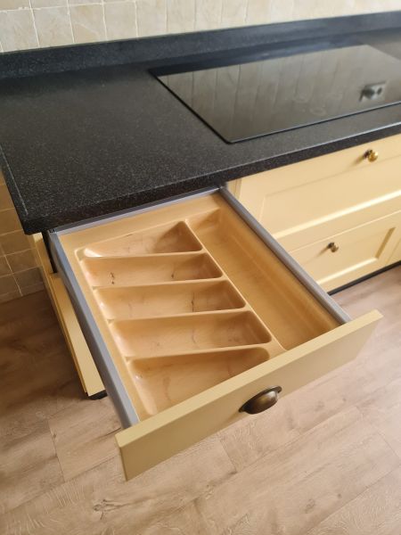 Bardzo ładna, duża kuchnia z dwoma szafkami narożnymi w stylu farmhouse. Klasyczne i ponadczasowe fronty z ramką, zawsze były są i będą modne i pasujące do każdego wnętrza. Kuchnia wykonana bardzo solidnie, była robiona przez stolarza, szafki wykonane z dobrej jakości płyty meblowej, ciężkie masywne, bardzo solidne. Fronty drewniane, kolor jest oryginalny, nie były przemalowywane. Kolor ciepły, przyjemny, dodający ciepła do wnętrza, podbija głębię koloru ciemnego blatu. Dobry wybór w połączeniu z kamieniem i drewnem. Stan frontów aż zaskakująco bardzo dobry, brak uszkodzeń, ślady użytkowania bardzo znikome, praktycznie nie do zauważenia, nawet dla mnie. Gałki mosiężne. Blaty z kamienia, piękny czarny granit, blat w trzech kawałkach + cokoły do około blatu. Nie brakuje tutaj funkcjonalnych rozwiązań, bardzo dużo szuflad, karuzela, fronty otwierane do góry - zapewniają komfortowy dostęp do przechowywanych rzeczy. Nie przypadkowe AGD, sprzęty są bardzo zadbane, bardzo ładne, płyta indukcyjna jest jak nowa, dosłownie- jak nowa! Lodówka - też. Lodówka duża, pojemna, na dole dwie szuflady do przechowywania, na górze zamrażarka. Nawet plastikowe półki w lodówce były wyłożone gumą żeby się przypadkiem nie porysowały, szok. Piec ma blachy i ruszty na prowadnicach - nie wyciągane a - wysuwane, bardzo komfortowe rozwiązanie. Piec bardzo zadbany, blachy, ruszty - jak nowe, żadnych śladów przypaleń, po prostu nic. Bardzo ładna zmywarka. Wszystkie sprzęty wyglądają idealnie po prostu. Nie ma tu w tej kuchni mankamentów do których można by się 'przyczepić', żadnych słabych stron, uszkodzeń na które trzeba zwrócić uwagę. Jest po prostu bardzo ładna, dobrze wykonana, solidna, zadbana. Piękna.
